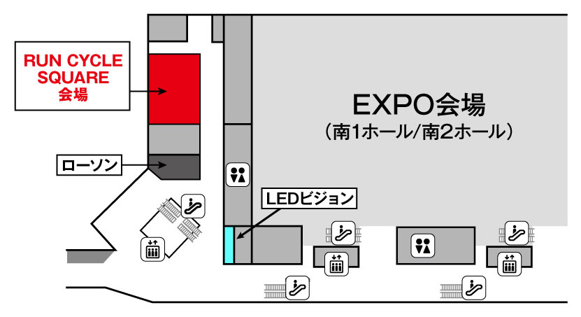 (南展示棟インフォメーションカウンターの奥を左へ、ローソン方向へお進みください。