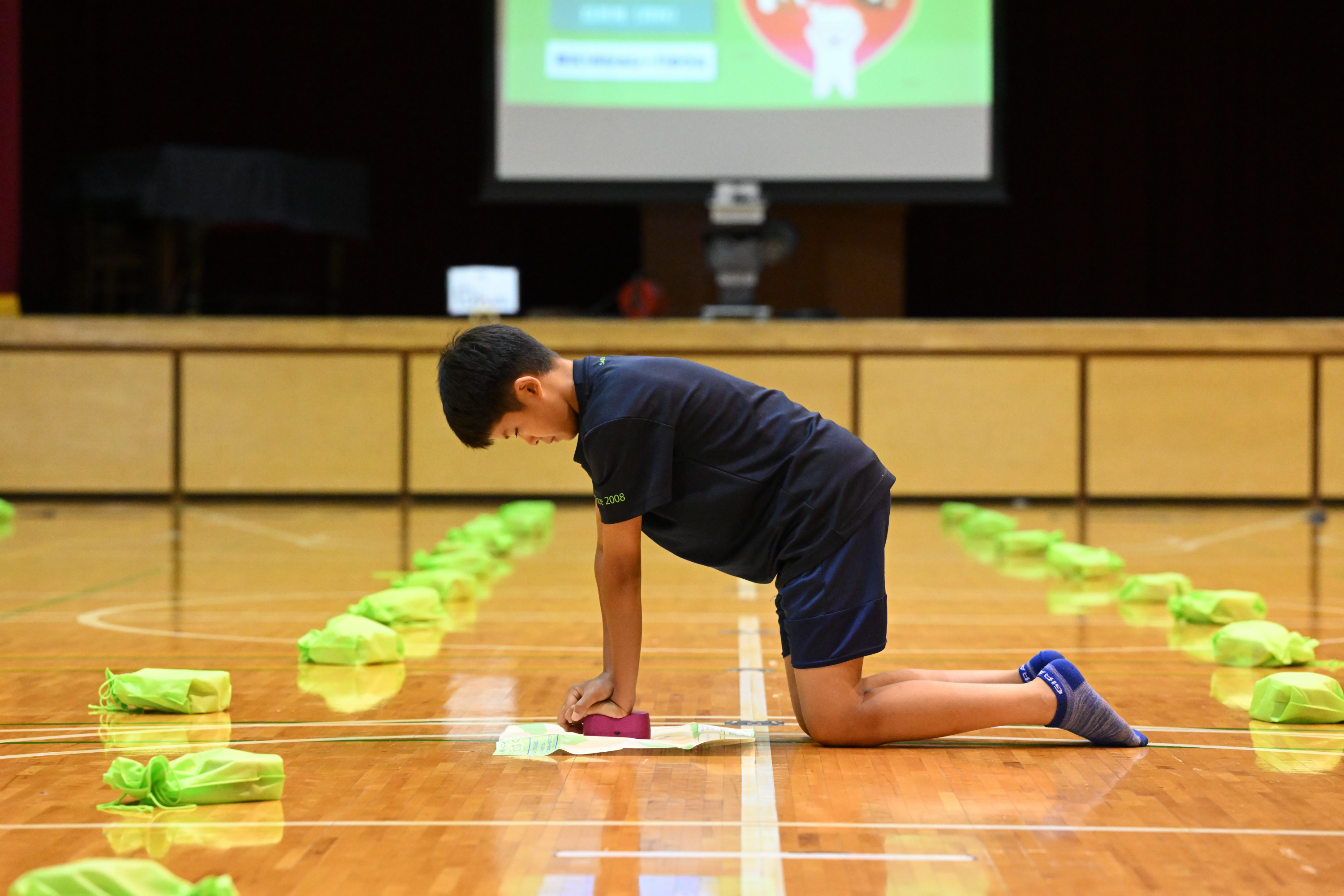 ハート型クッション教材「あっぱくん」を使用し、正しい位置・強さ・リズムを実際に体を動かして練習します。